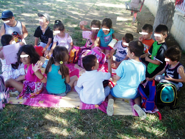 Κάτσαμε στην κουβέρτα, στρώσαμε τις πετσετούλες μας και φάγαμε το πρωινό μας αλλά και τα γλυκίσματα και τους χυμούς που έφερε η κυρία.